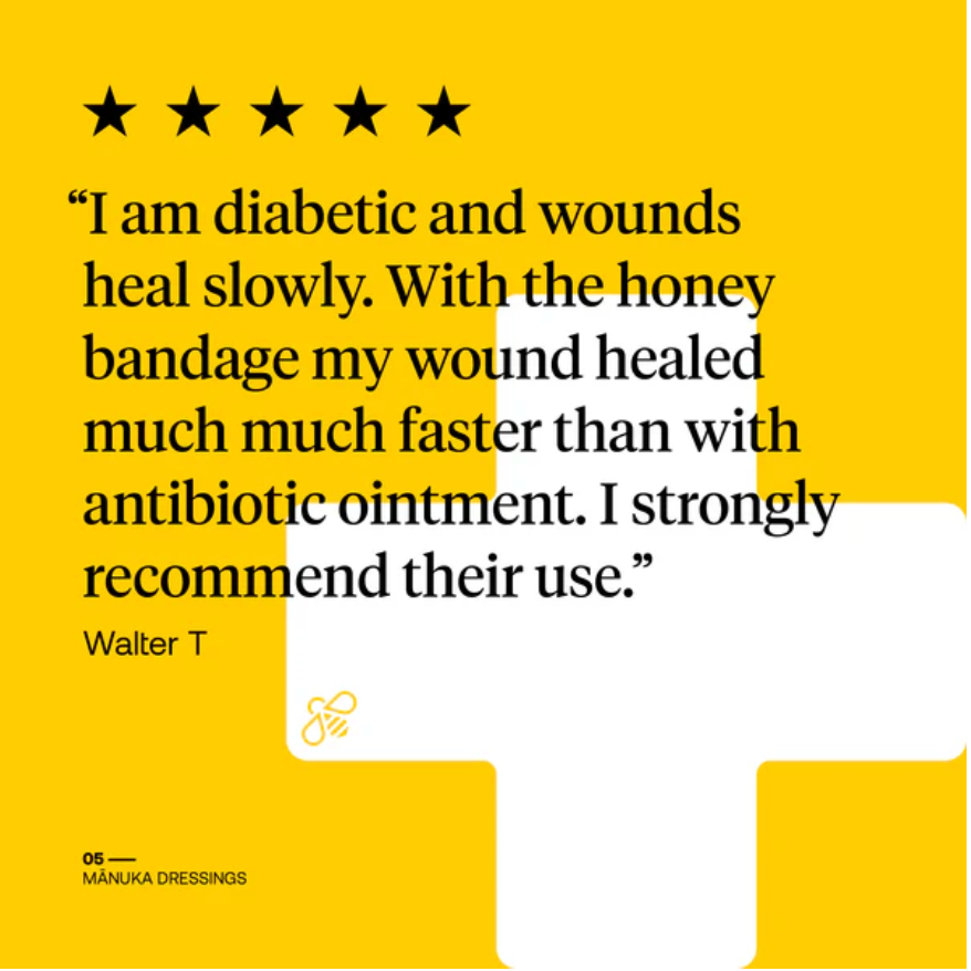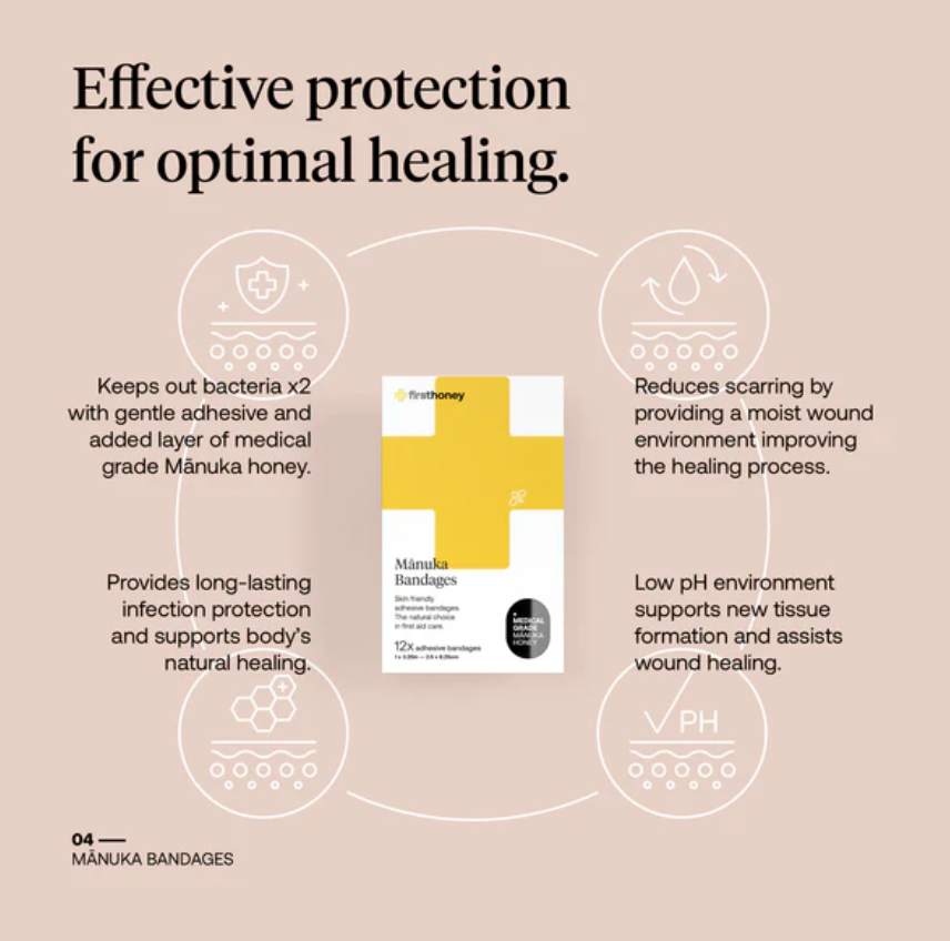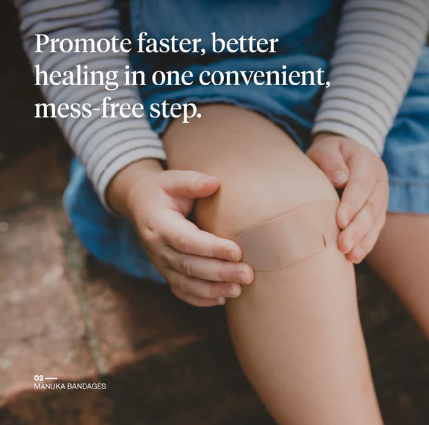 Mānuka honey bandages are innovative adhesives infused with the highest quality medical grade Mānuka honey to help promote faster, better healing while providing infection protection in one convenient, mess-free step. Specially designed to treat minor cuts and scrapes for the whole family, our Mānuka honey bandages are easy to apply and remove without pulling too hard on the skin.